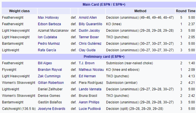Макс Холлоуэй (США, 23–7) – Арнольд Аллен (Англия, 19–1) – UD 5 (49–46, 49–46, 48–47)