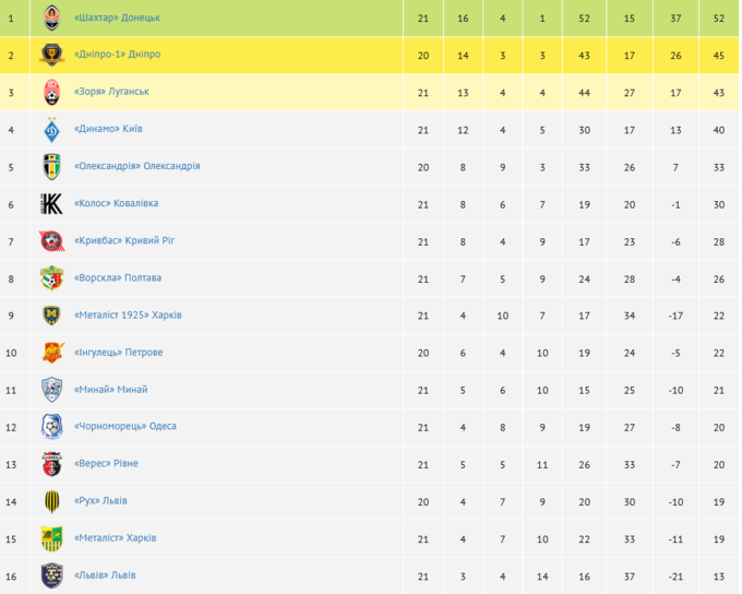 По итогам 21-го тура чемпионата Украины «Шахтер» сумел увеличить отрыв от «Днепра-1» до 7 очков. Команда Игора Йовичевича обыграла «Львов», а вот «Днепр-1» уступил «Заре».