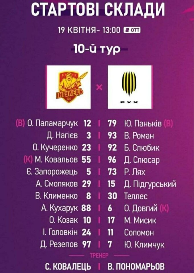Ингулец – Рух. Стартовые составы команд