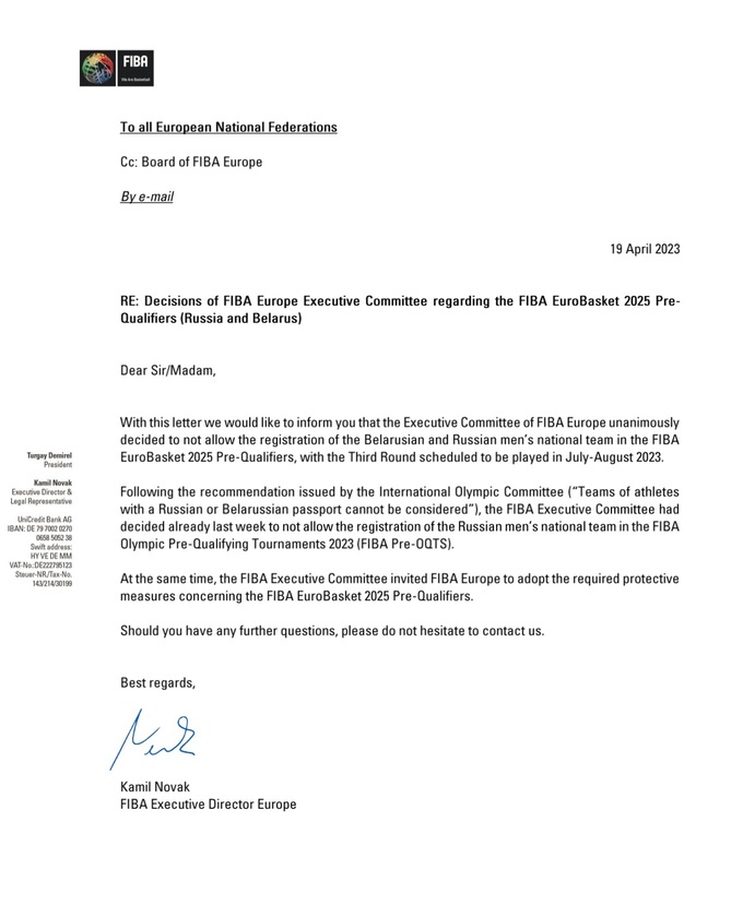 Федерация баскетбола Украины сообщила о том, что ФИБА-Европа приняла единогласное решение не допускать российскую и белорусскую национальные сборные к участию в предварительной квалификации Евробаскета-2025, матчи которой состоятся в июле-августе 2023 года.