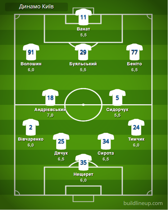 «Динамо» Киев: Нещерет – Вивчаренко, Дячук, Сирота, Тимчик – Андриевский, Сидорчук – Волошин (Гармаш, 75), Буяльский (Царенко, 75), Бенито – Ванат (Рамирес, 75).