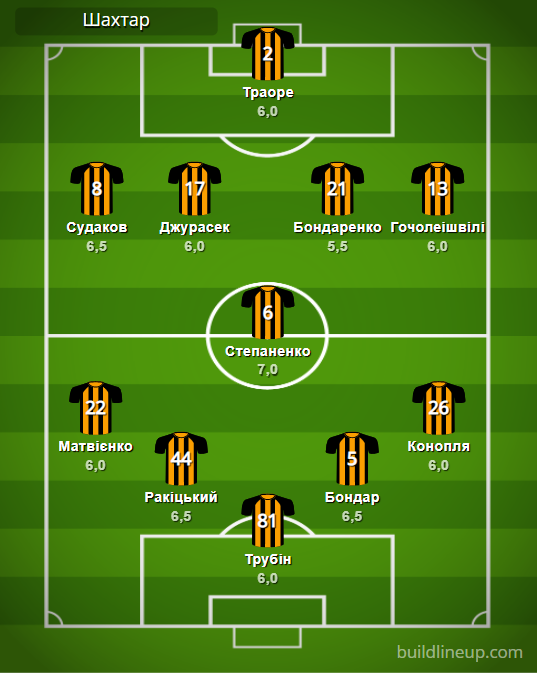 «Шахтер»: Трубин – Матвиенко, Ракицкий (Михайличенко, 60), Бондарь, Конопля – Степаненко – Судаков, Джурасек (Назарина, 61), Бондаренко, Гочолеишвили (Швед, 75) – Траоре (Сикан, 75).