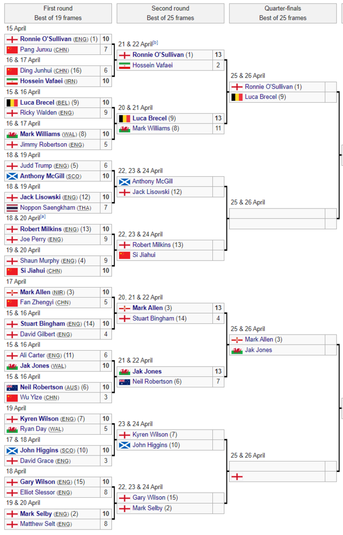 Неожиданным стало поражение австралийца Нила Робертсона (6-й номер посева) от квалифаера Джека Джонса из Уэльса (7:13), которому в четвертьфинале будет противостоять Марк Аллен, разгромивший Стюарта Бингема (13:4).