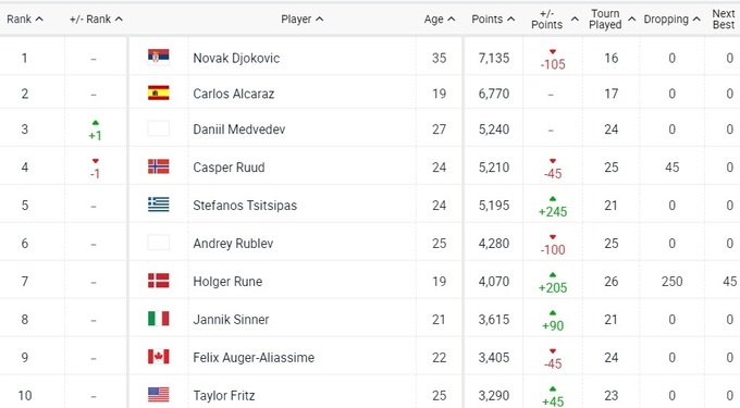В первой десятке состоялось одно изменение – Каспер Рууд уступил третью позицию Даниилу Медведеву.