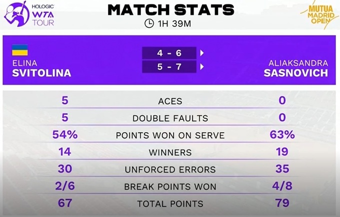 Элина Свитолина (Украина) – Александра Саснович – 4:6, 5:7