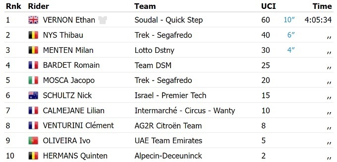 Британский велогонщик команды «Soudal Quick Step» Итан Вернон стал победителем первого этапа швейцарской многодневки Тур Романдии и перехватил лидерство в общем зачете. В финишном спринте он опередил бельгийцев Тибо Ниса и Милана Ментена.