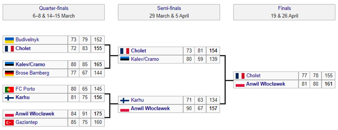 Первый финальный матч выиграла польская команда со счетом 81:77, а после второй игры табло зафиксировало счет 80:78. Польский клуб стал победителем Кубка Европы по сумме двух матчей.