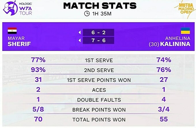 Украинская теннисистка Ангелина Калинина (№34 WTA) в своем стартовом матче на турнире WTA 1000 в Мадриде в рамках второго круга выяснила отношения с Майяр Шериф из Египта (№59 WTA).