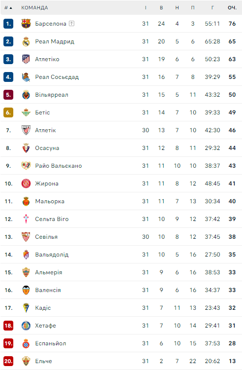 Ситуация в хвосте турнирной таблицы: Вальядолид (35), Альмерия и Валенсия (по 33), Кадис (32), Хетафе (31), Эспаньол (28), Эльче (13).