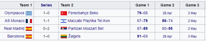 В баскетбольной Евролиге началась стадия вторых четвертьфинальных матчей. Серии идут до трех побед.
