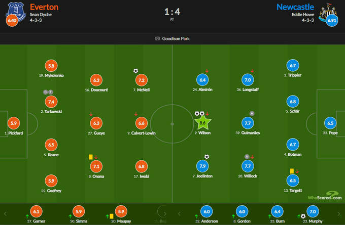 Оценки WhoScored за матч Эвертон – Ньюкасл – 1:4