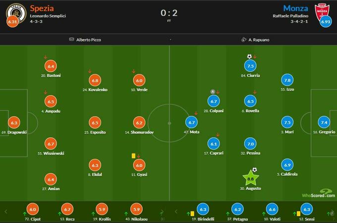 «Монца» одержала третью победу подряд и вошла в топ-10 (44 очка). «Специя» с 27 очками борется за выживание (17-я позиция).