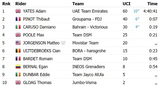 Британский велогонщик команды «UAE Emirates» Адам Йейтс стал победителем четвертого этапа швейцарской многодневки Тур Романдии с горным финишем Тион 2000. Он опередил француза Тибо Пино из «Groupama DFJ» и итальянца Дамьяно Карузо из «Bahrain Victorious» и возглавил общий зачет.