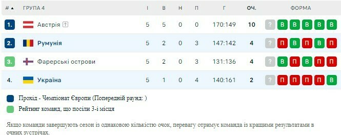На Евро выйдут первое и второе места каждой группы, а также четыре лучшие команды, которые займут третье место. У нас в группе, кроме румын, есть еще Австрия и Фарерские острова. Как раз Фарерам мы недавно уступили (33:26) и максимально усложнили себе ситуацию. Теперь нам нужно надеяться на поражение островитян в последнем туре и побеждать Румынию с разницей в 13 мячей (тогда займем второе место) или 8 мячей (тогда будем третьи, но при этом нужно забросить минимум 23 гола). Игра первого круга закончилась поражением «сине-желтых» со счетом 34:26.