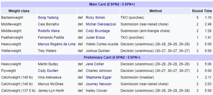 В главном бою вечера Сун Ядун из Китая (19–7–1) нокаутировал Рикки Симона из США (20–3).
