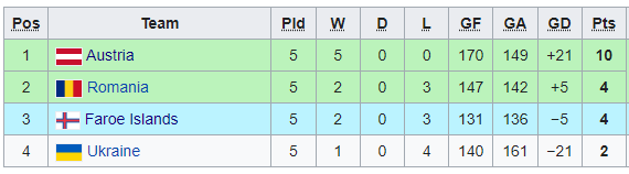 В группе играют сборные Австрии (10 очков и досрочная путевка на ЧЕ), Румынии, Фарерских островов (по 4 очка) и Украины (по 2 очка).