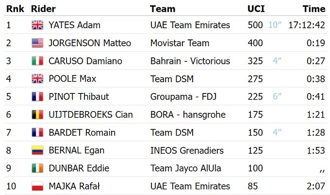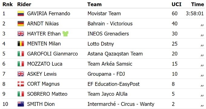 Заключительный этап выиграл колумбиец Фернандо Гавирия из «Movistar», который в финише опередил немца Никьяса Арндта из «Bahrain Victorious» и британца Итана Хейтера из «Ineos Grenadiers».