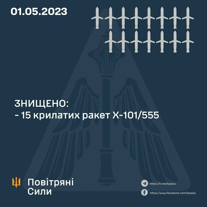 Во время ночной воздушной атаки российских оккупантов украинские силы противовоздушной обороны уничтожили 15 из 18 крылатых ракет типов Х-101 и Х-555. Об этом сообщает Главнокомандующий Вооруженными силами Украины Валерий Залужный.