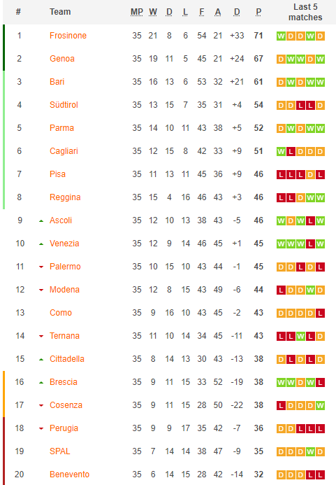 «Фрозиноне» набрал 71 очко и за три тура до финиша оторвался от идущего третьим «Бари» на 10 очков, обеспечив себе одну из двух прямых путевок в элиту.