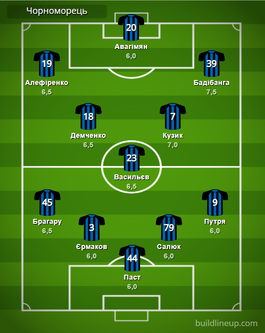 «Черноморец»: Паст – Брагару, Ермаков, Салюк, Путря – Демченко (Политило, 89), Васильев, Кузык (Задоя, 83) – Алефиренко (Войтиховский, 88), Авагимян (Гладкий, 83), Бадибанга (Штогрин, 82).