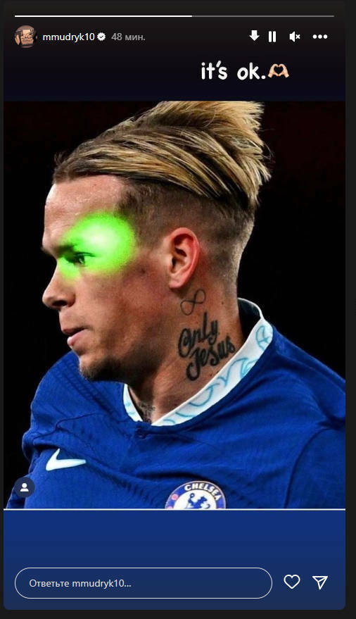 После матча Мудрик опубликовал в stories Instagram фото момента с лазером.