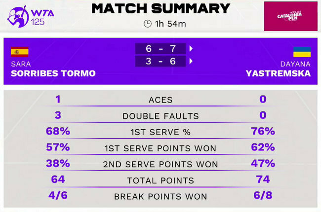 Сара Соррибес-Тормо (Испания) – Даяна Ястремская (Украина) – 6:7 (5:7), 3:6