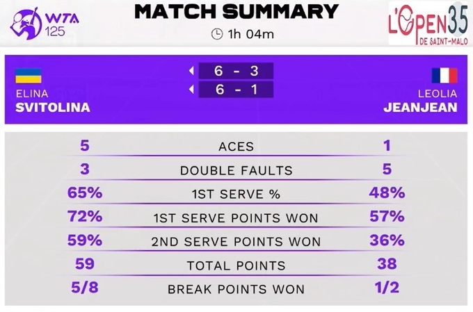 Украинская теннисистка Элина Свитолина добыла еще одну победу на турнире WTA 125 в Сен-Мало (Франция).