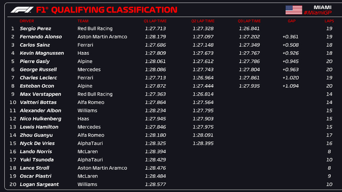 Состоялась квалификация Формулы-1 в рамках Гран-при Майами. Поул выиграл пилот Ред Булла Серхио Перес, который удачно воспользовался аварией Шарля Леклера.