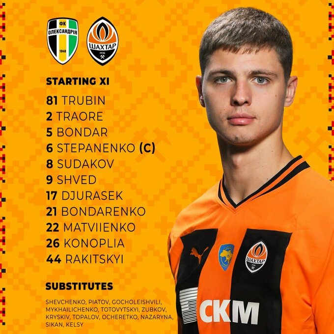 «Шахтер»: Трубин, Конопля, Бондарь, Ракицкий, Матвиенко, Бондаренко, Степаненко, Джурасек, Швед, Судаков, Траоре.