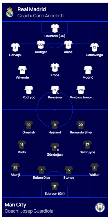 Реал Мадрид: Куртуа, Рюдигер, Алаба, Карвахаль, Камавинга, Кроос, Модрич, Вальверде, Родриго, Винисиус, Бензема.