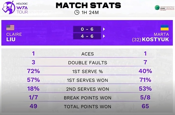 Марта Костюк (Украина) – Клэр Лю (США) – 6:0, 6:4