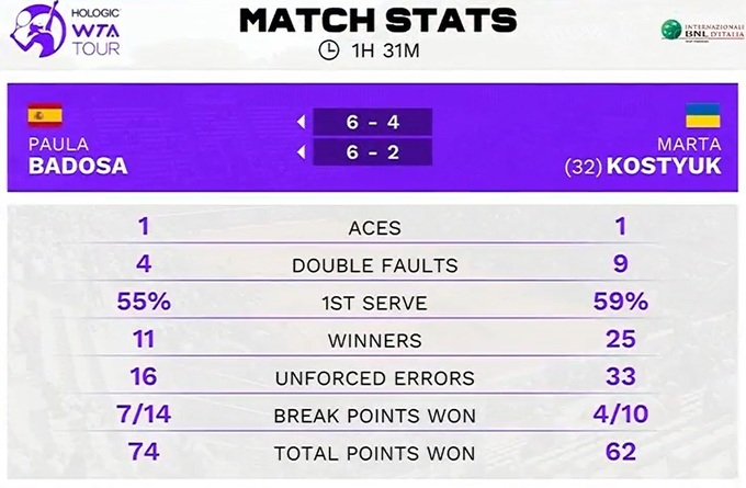 Марта Костюк (Украина) – Паула Бадоса (Испания) – 4:6, 2:6