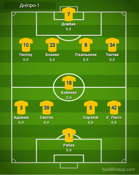 «Днепр-1»: Рыбак – Адамюк, Сваток, Сарапий, Е. Пасич (Матаррита, 81) – Бабенко – Пеглоу, Бланко (Рубчинский, 63), Пихаленок (Когут, 82), Танчик (Пидлепенец, 63, Хайнер, 72) – Довбик.
