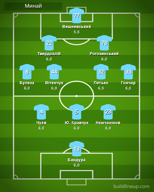 «Минай» (замены): Дмитрук – 6,0, Шишка – б/о, Гечев – б/о, Коломоец – б/о, Байдал – б/о.