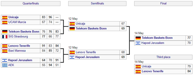 «Бонн Телеком» выиграл баскетбольную Лигу чемпионов. В финале турнира немецкий клуб победил «Хапоэль» из Иерусалима – 77:70. Отметим, что «Бонн Телеком» стал пятым немецким клубом, которому покорился еврокубок.