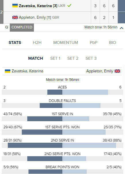 Катарина Завацкая (Украина) – Эмили Эпплтон (Великобритания) – 3:6, 6:2, 6:1