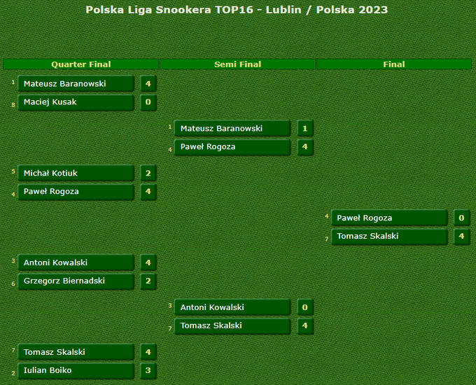 Украинский снукерист Юлиан Бойко дошел до 1/4 финала турнира Polska Liga Snookera TOP16 в польском Люблине.