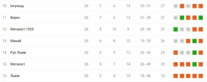 Следовательно, на две вакансии участников переходных поединков претендуют сразу пять команд: «Верес», «Ингулец», «Металлист-1925», «Минай» и «Рух». Очковая разница между идущим на десятом месте «Вересом» и 14-м «Рухом» – всего три очка.