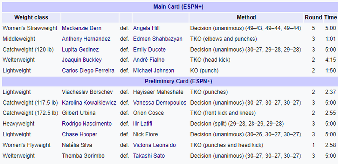 В главном бою вечера Маккензи Дерн (США, 12–3) по очкам победила Анджелу Хилл (США, 15–12)