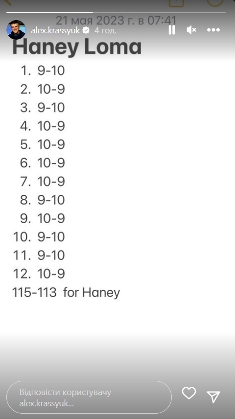 По подсчетам Красюка, Хейни выиграл у Ломаченко со счетом 115:113. Подсчетом очков промоутер поделился в своем Инстаграме.