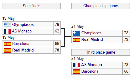 - 20:00. Олимпиакос (Греция) – Реал Мадрид (Испания) – 78:79 (24:17, 21:28, 18:14, 15:20)