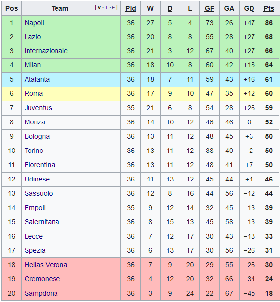 После нового решения о штрафе для «Юве» в 10 очков произошли изменения в турнирной таблице. «Лацио» со второго места гарантировал себе путевку в Лигу чемпионов, а туринский клуб опустился на 7-ю позицию.