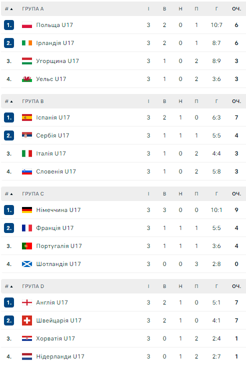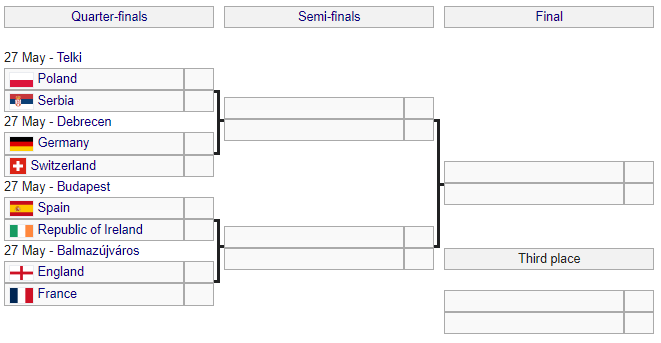 В матчах 1/4 финала 27 мая встретятся: Польша – Сербия, Германия – Швейцария, Испания – Ирландия, Англия – Франция.