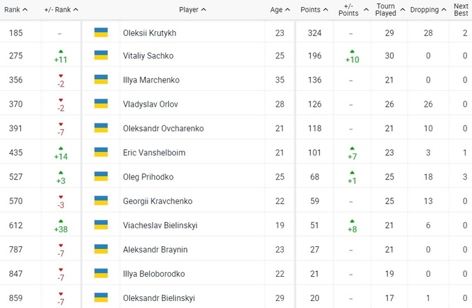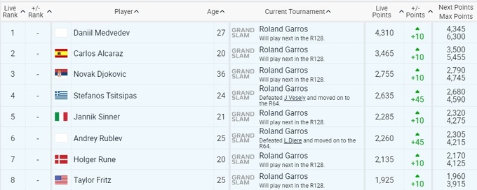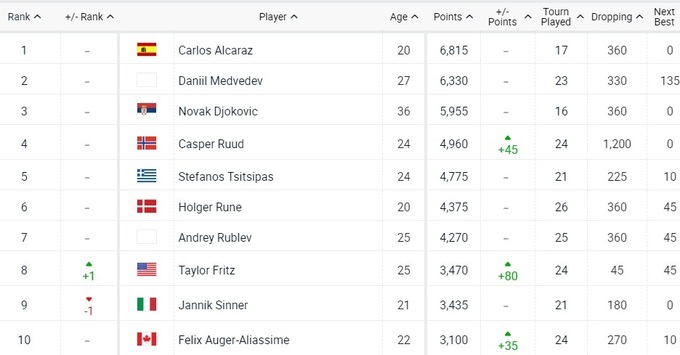 В первой десятке состоялось одно изменение, Тэйлор Фритц опередил Янника Синнера.