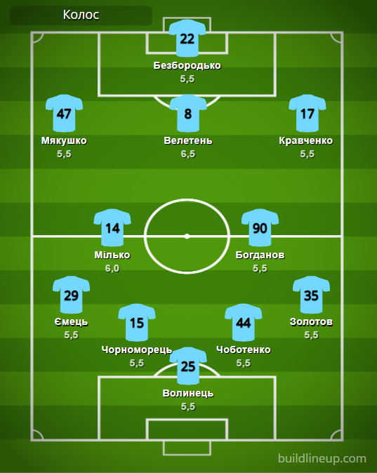 «Колос»: Волынец – Емець, Чорноморец, Чоботенко, Золотов – Милько (Ильин, 57), Богданов – Мякушко, Велетень (Болбат, 66), Кравченко – Безбородько (Попов, 67).