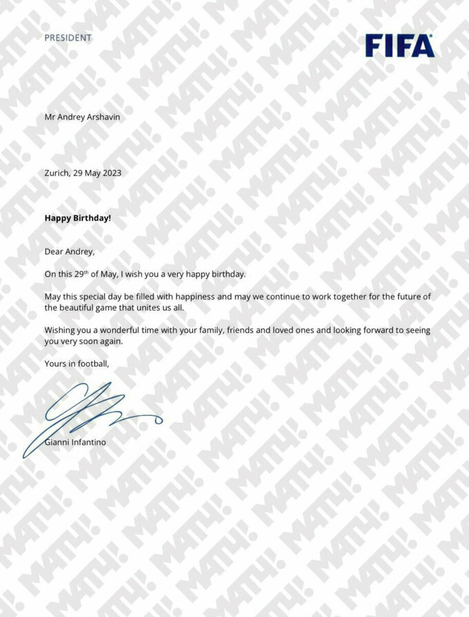 Президент ФИФА Джанни Инфантино направил поздравительное письмо экс-футболисту из рф Андрею Аршавину, которому исполнилось 42 года.