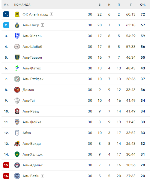 «Аль-Иттихад» (72 очка) в качестве чемпиона страны получил путевку в групповой раунд Лиги чемпионов Азии и Клубный чемпионат мира 2023.