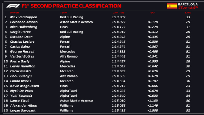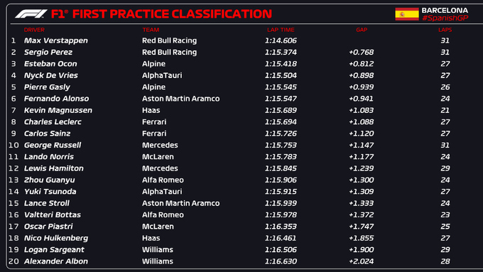 На Гран-при Испании состоялись две пятничные практики. В обеих тренировочных сессиях быстрейшим был Макс Ферстаппен. Сперва пилот Ред Булла опередил напарника Серхио Переса, а затем пилота Астон Мартин Фернандо Алонсо.