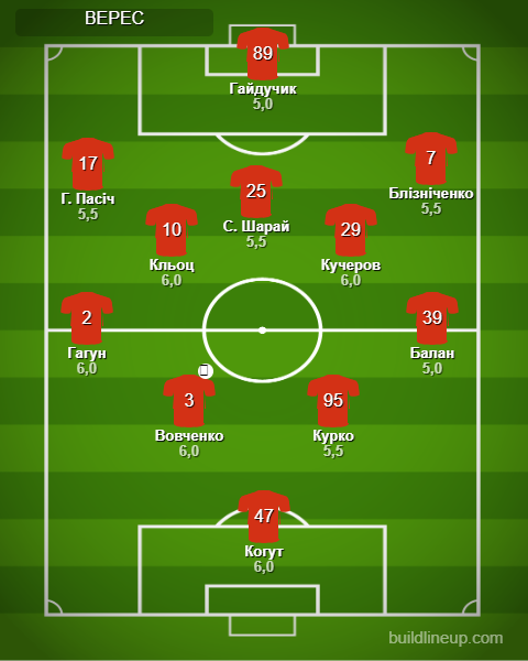 «Верес»: Когут – Гагун, Курко, Вовченко, Балан – Клец (Годя, 90+1), Кучеров – Г. Пасич (М. Шестаков, 72), С. Шарай (Лебеденко, 64), Близниченко (Дахновский, 90+1) – Гайдучик (В. Шарай, 72).