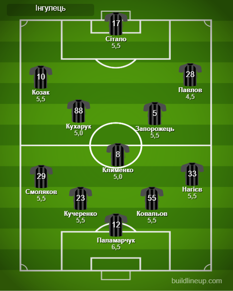Замены Ингульца: Сидоренко - 5,5, Кравчук - 5,0, Козыренко - 5,0, Резепов - 5,0.